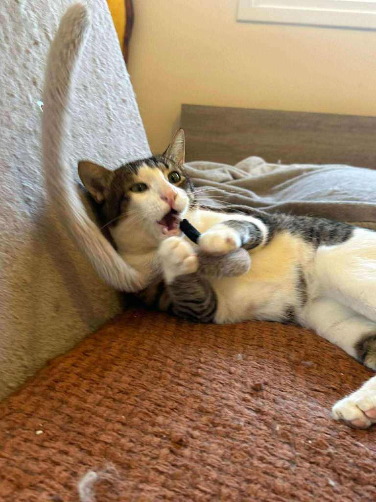 Maar toch, blijft hij vrolijk en zorgeloos. Hij speelt alsof er geen morgen is, kan goed overweg met andere katten en houdt stiekem van knuffels, al doet hij alsof hij daar te stoer voor is.