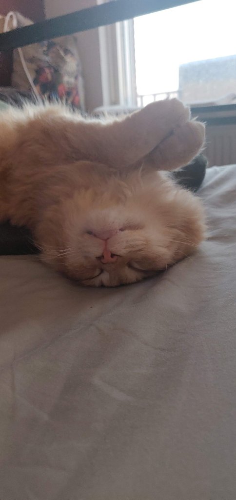 Ook slapen deed hij op zijn eigen manier. Ogen dicht? Welnee. Hij lag doodstil met halfopen ogen, dromend of juist nergens. We moesten soms zijn ogen voor hem sluiten en hij had oogdruppels nodig.